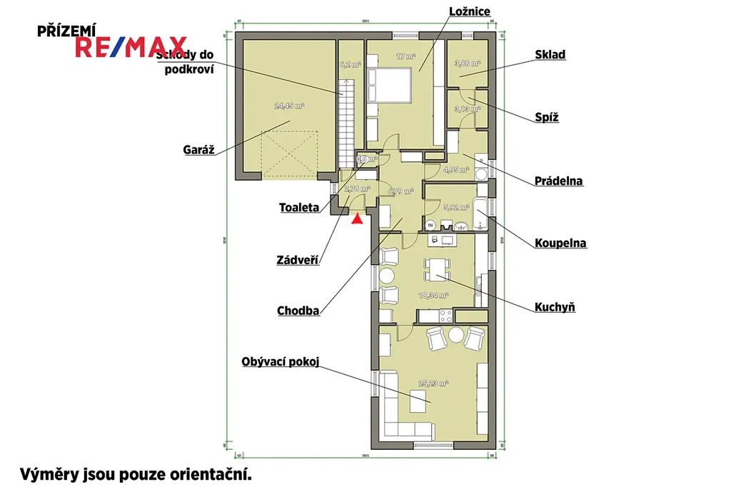 Praktickou část domu tvoří velká garáž, prádelna, samostatné WC a dvě nadzemní sklepní kóje/skladovací prostory – ideální pro sportovní vybavení, dílnu či zahradní techniku. Velkým benefitem je také prostorná půda s možností půdní vestavby, která nabízí potenciál rozšíření obytné plochy dle potřeb nové rodiny.