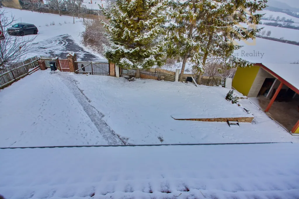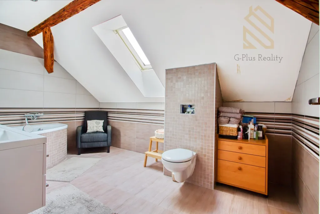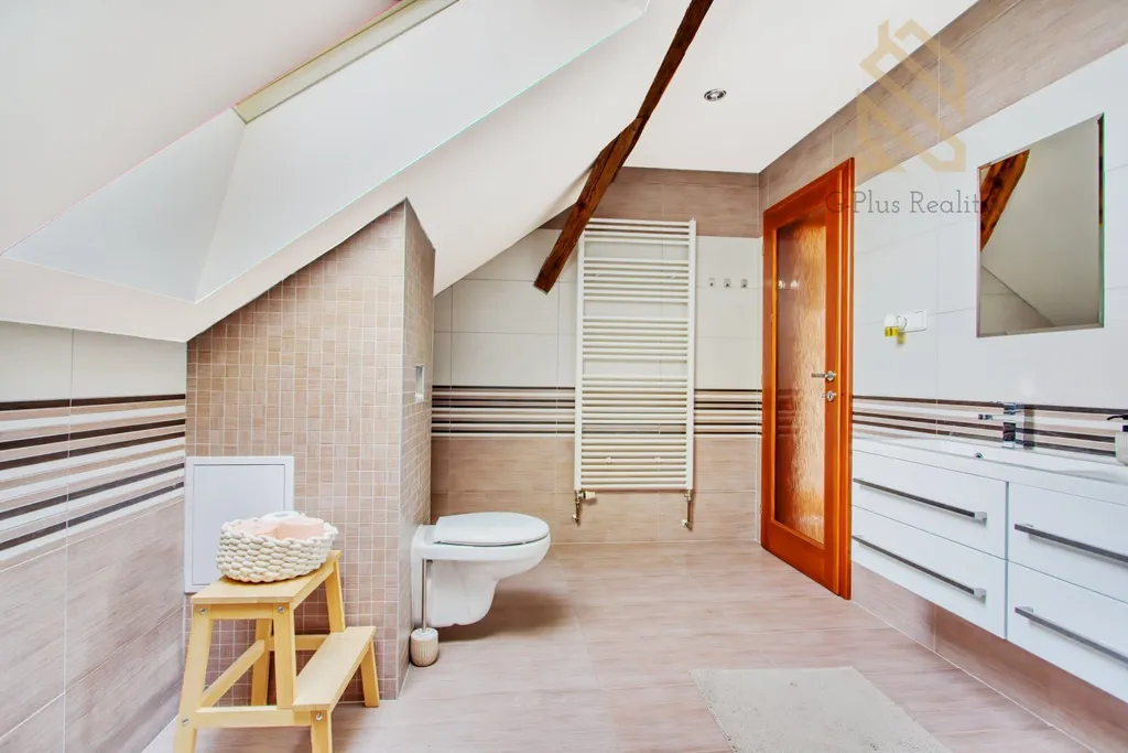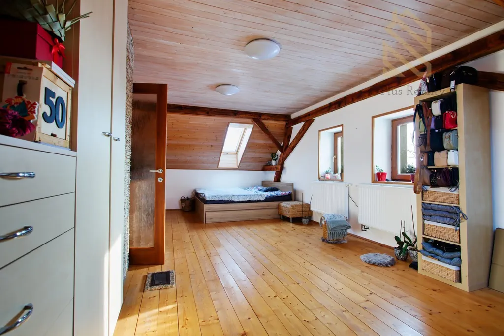 Do patra vede nově vybudované dřevěné schodiště, které působí velmi esteticky a zároveň prakticky. V horním podlaží se nachází další pokoje a druhá koupelna, což umožňuje komfortní dvougenerační bydlení nebo oddělený prostor pro hosty. Velkou výhodou je také podkroví, které je možné vybudovat po celé ploše domu a získat tak další plnohodnotný obytný prostor. Část domu je podsklepená, což poskytuje dostatek úložného místa.