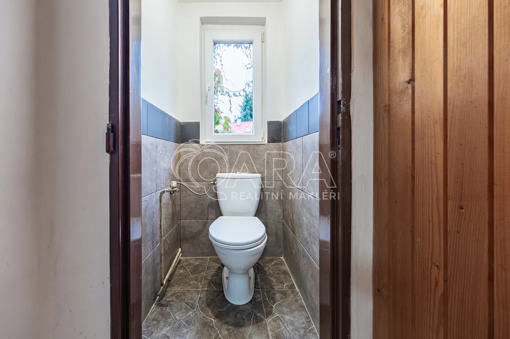 První podlaží: prostorná předsíň, obývací pokoj s krbovými kamny, kuchyňka s jídelním koutem, toaleta a koupelna se sprchovým koutem a umyvadlem.