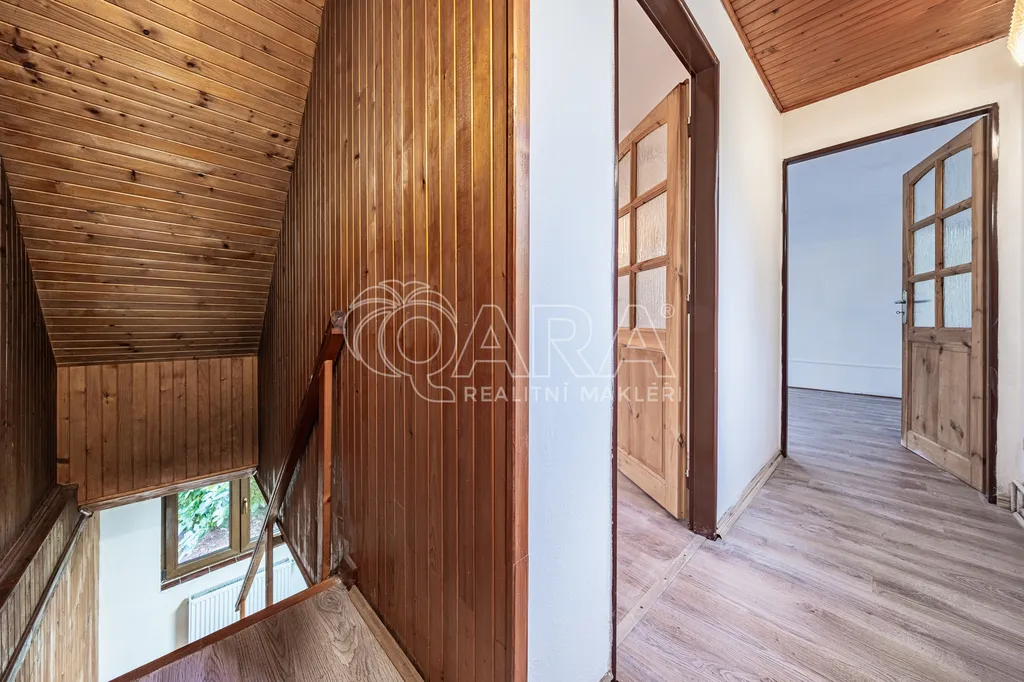 Druhé podlaží: dvě útulné ložnice s plovoucí podlahou, z obou je vstup na prostornou terasu s krásným výhledem do okolní zeleně. V tomto podlaží jsou původní dřevěná okna, která zachovávají původní charakter chaty.