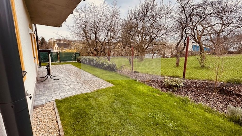 Zahradu tvoří částečně travnatá plocha a částečně dlažba v prostoru terasy a zpevněný chodník, vedoucí až k vstupní brance k parkovišti. Pozemek je kompletně oplocen. Je možné používat hlavní vchod, ale i soukromý vstup z parkoviště.