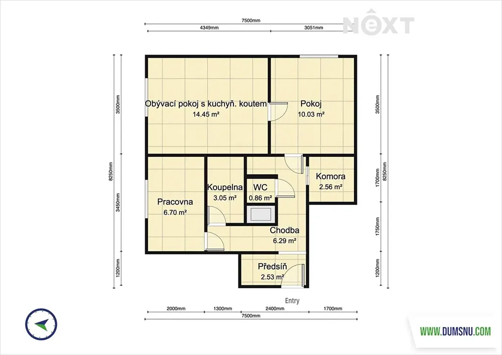 Byt má vstupní předsíň, ze které se pokračuje do chodby. Odtud je přístup do koupelny, samostatné toalety, praktické komory využitelné jako šatna nebo úložný prostor a menší místnosti vhodné jako pracovna. Na konci chodby se nachází samostatný pokoj, ze kterého se vstupuje do obývacího pokoje s kuchyňským koutem.