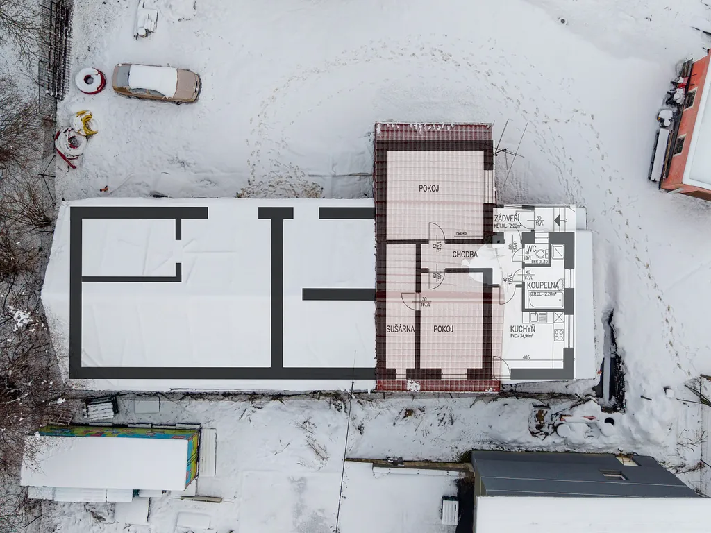 Dům o celkové užitné ploše cca 180 m² (obytná část s dispozicí 2+1 a plochou cca 60 m²) je určen k rekonstrukci, což novému majiteli otevírá dveře k vytvoření moderního domova přesně podle vlastních představ. Nemovitost je napojena na inženýrské sítě (elektřina, vodovod, kanalizace). Výhodou tohoto domu je velký pozemek o ploše 3801 m² (v Územním plánu veden jako stavební/ plocha SV se zastavitelností 40%) a také samostatná garáž 30 m².