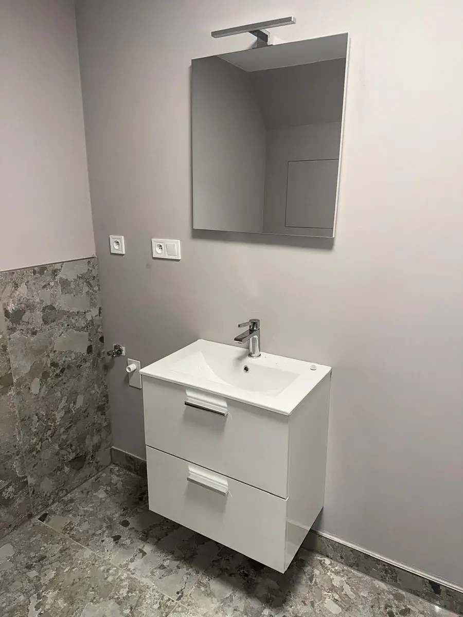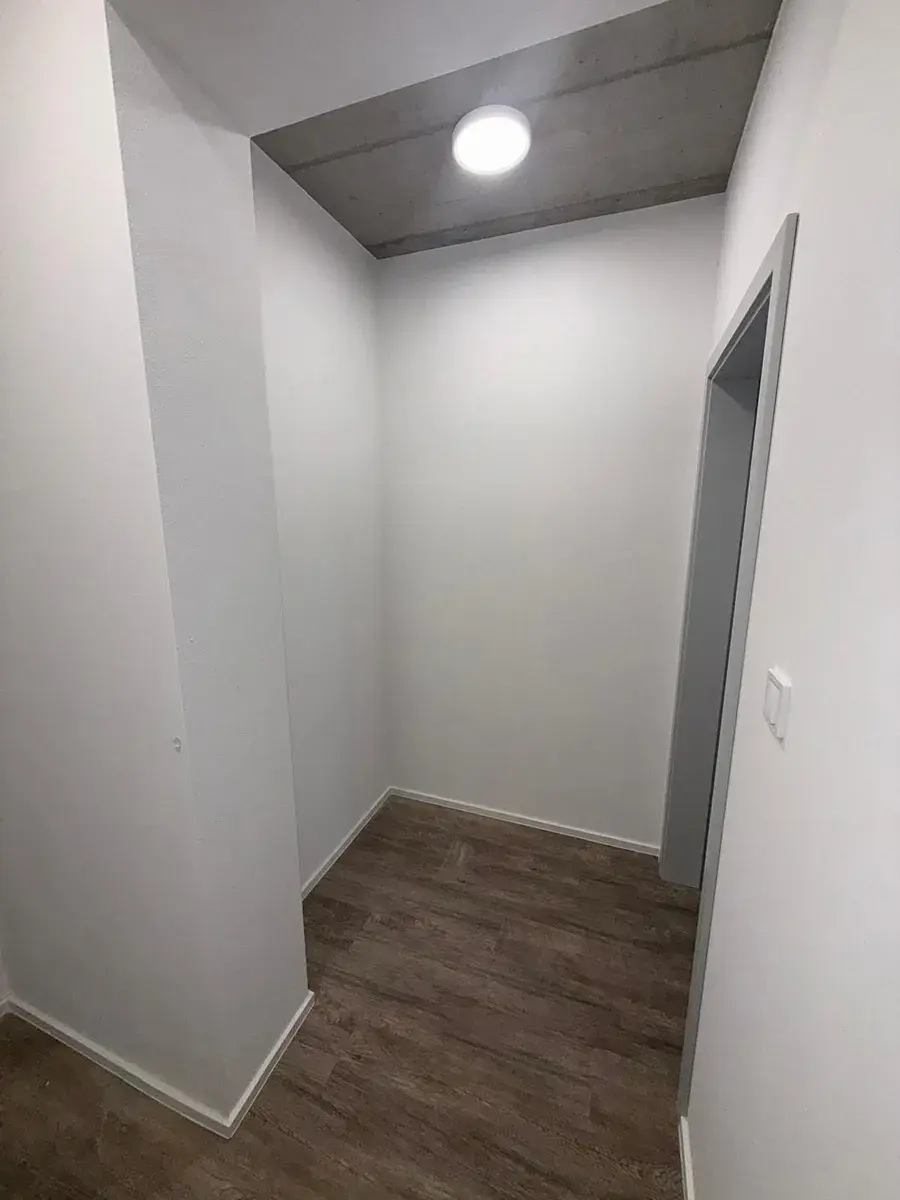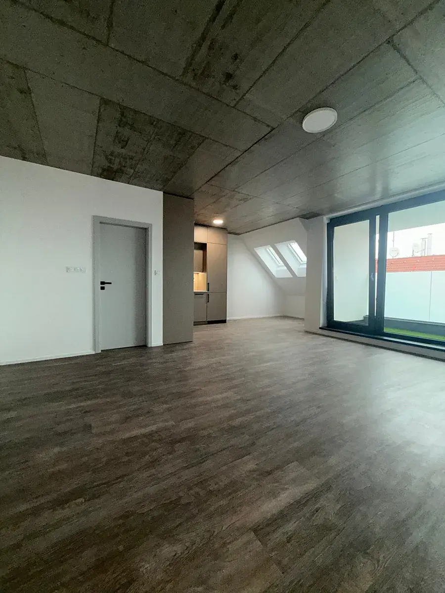 Díky velkorysé výměře je možné obytnou část pohodlně rozdělit na obývací a spací zónu – například pomocí moderního regálu nebo paravánu. Do prostoru se snadno vejde velký rozkládací gauč nebo manželská postel, aniž by byt ztratil svůj vzdušný charakter.