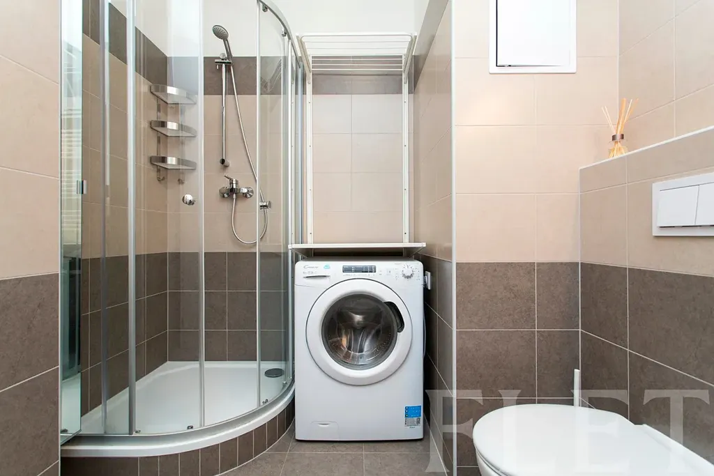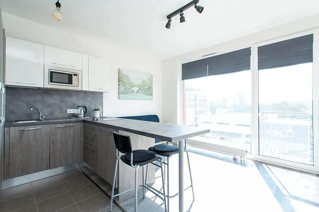 Při vstupu do bytu vás uvítá prostorná předsíň, ze které se dostanete do pokoje s vestavěnou skříní a moderně zařízeným kuchyňským koutem, jehož součástí je barový jídelní stůl se dvěma židlemi a také vestavěná mikrovlnná trouba a varná deska. V pokoji je také pohodlný rozkládací gauč. Velká francouzská okna v bytě zajistí dostatek světla, venkovní i vnitřní rolety zase soukromí. V bytě se nachází také hezká a světlá koupelna se sprchovým koutem, toaletou a pračkou.