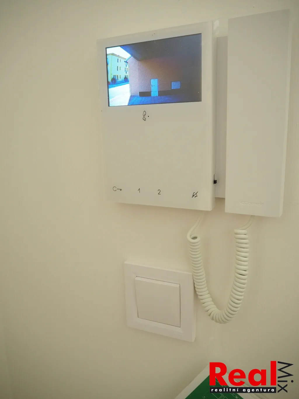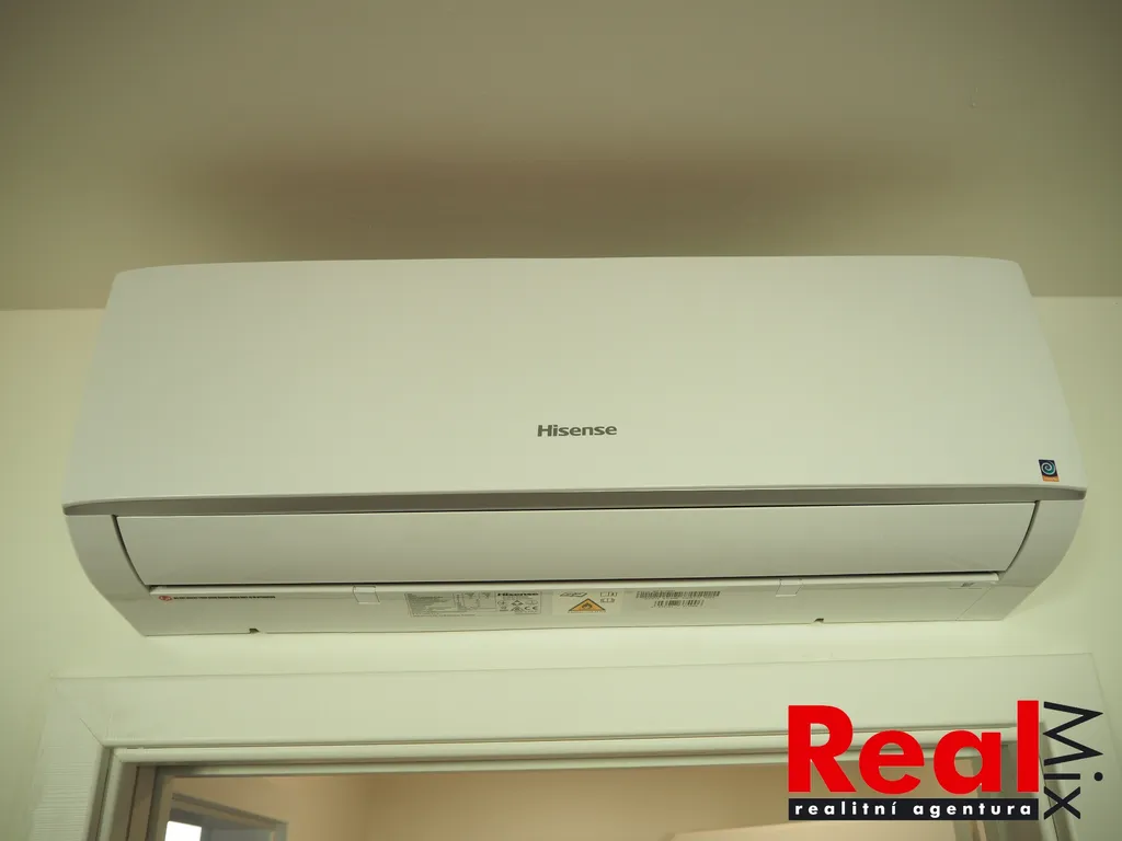 Byt je částečně zařízen (stůl, židle, policový úložný systém v předsíni) a vybaven klimatizací (s tepelným čerpadlem na střeše objektu), dále je zde kuchyňská linka s vestavěnými spotřebiči (el. varná deska), lednice s mrazákem, koupelna se sprchovým koutem, závěsné WC, dlažba, plovoucí laminátové podlahy, kvalitní plastová okna (protihluková troj-skla), klimatizace, vytápění centrální plynové (společná kotelna v domě) + elektrické podlahové vytápění v koupelně, teplá voda z centrální kotelny v domě (samostatné měření pro každou jednotku), balkón s nášlapnou vrstvou - dlažba na terčích. Pozn.: pračka není součástí vybavení, ale lze ji od původního nájemce odkoupit, je těstě po záruce, za cenu 4 tis Kč.