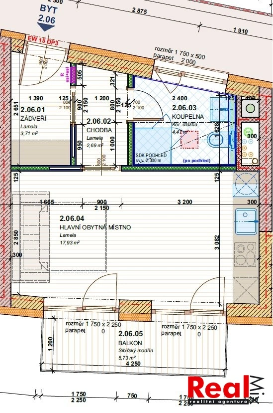 Dispozice bytu: zádveří 4m2, chodba 3m2, koupelna 4,5m2, hlavní obytná místnost 18m2, balkón 5m2. Orientace bytu je do klidného parku na V.