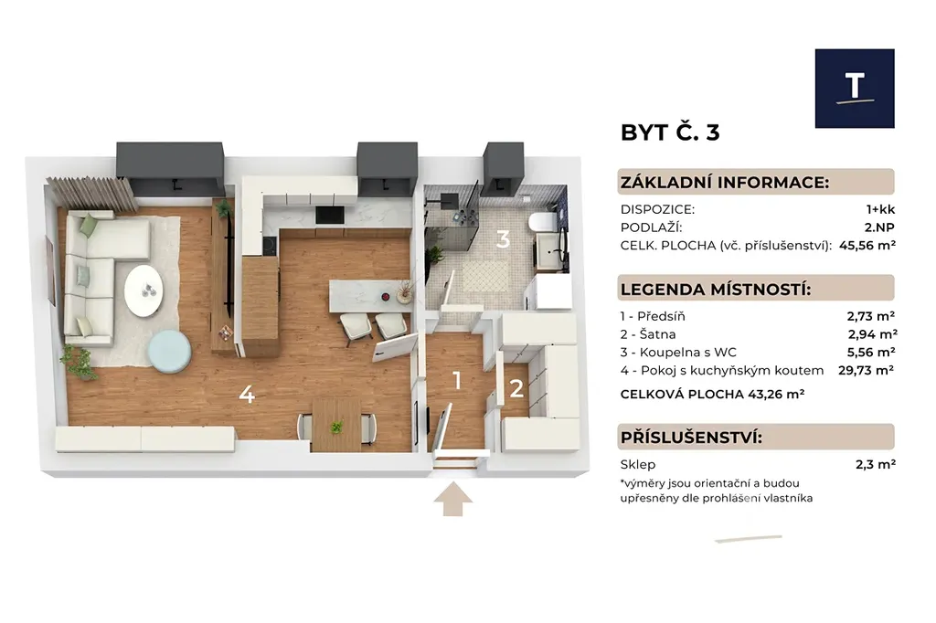 Byt je navržen s důrazem na vzdušnost a praktičnost. Otevřený obytný prostor s kuchyňským koutem přirozeně propojuje zónu pro vaření, práci i odpočinek. Velkoformátová okna zajišťují dostatek denního světla a příjemnou atmosféru. Promyšlené úložné prostory umožňují variabilní uspořádání interiéru podle vlastního stylu.