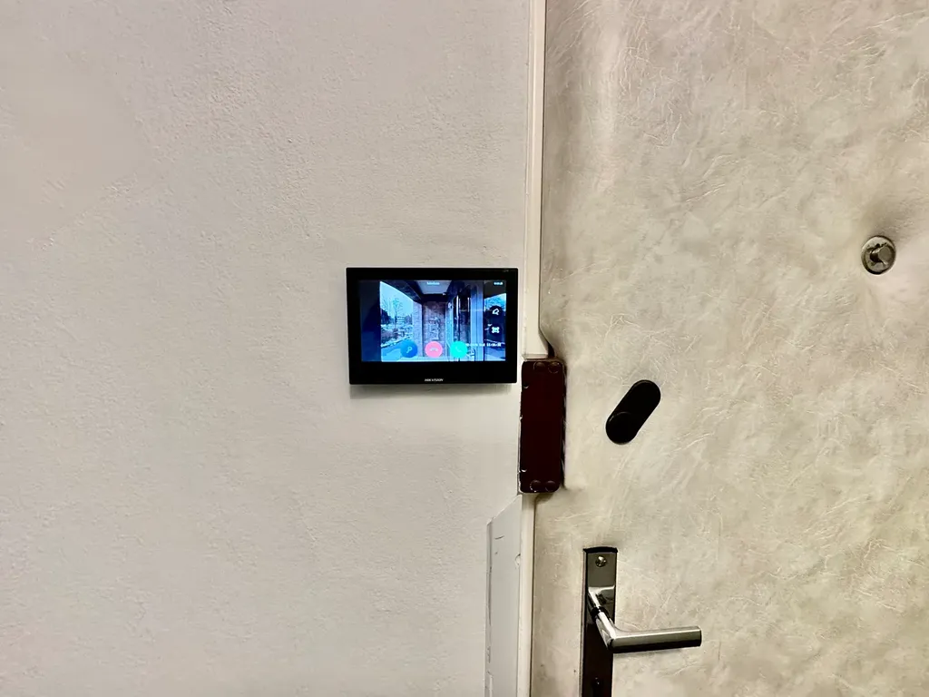 U vstupu do domu je instalován kamerový systém a v bytě je monitor, který zobrazuje osobu u vstupních dveří, což zvyšuje komfort i bezpečnost bydlení.