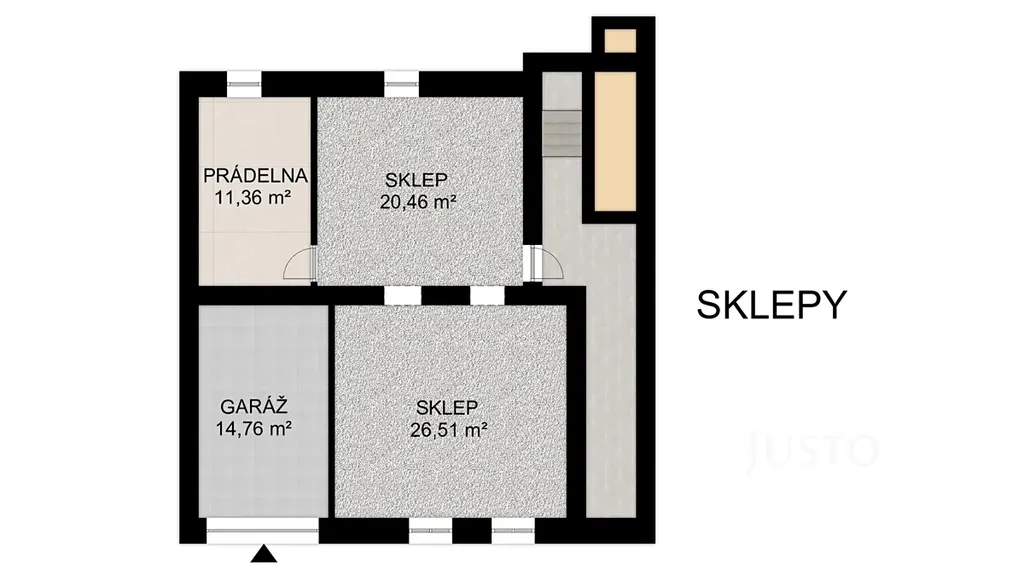 Dům je podsklepený – v suterénu se nachází garáž pro jedno menší vozidlo a prostorné skladové místnosti, ideální pro dílnu, hobby zázemí či uskladnění sezónních věcí.