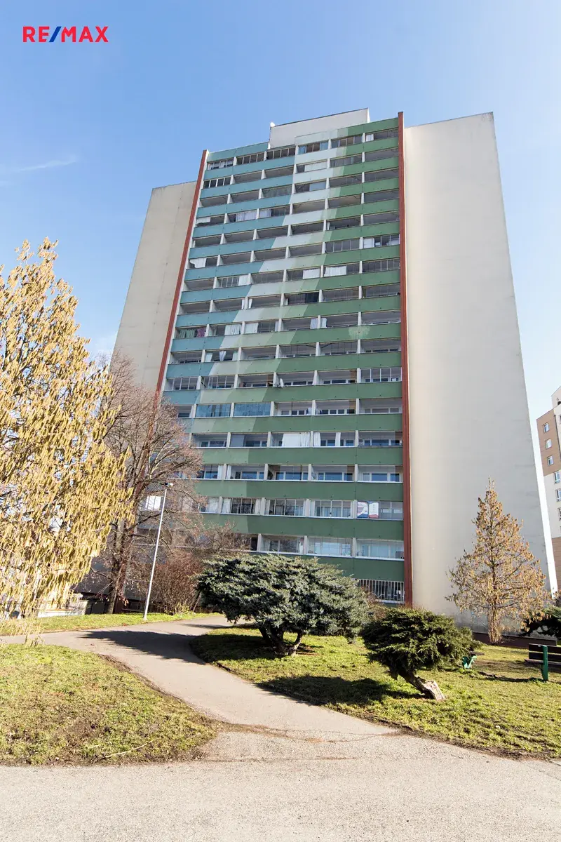 Nabízíme k pronájmu byt 2+kk o velikosti 49 m2 plus dvě zasklené lodžie (celkem 6 m2) ve 12. patře panelového domu. Celkem má tedy byt 56 m2. Má dva pokoje, z každého je možný vstup na lodžii západním směrem. V jednom z pokojů je kuchyňský kout vybavený elektrickou varnou deskou a lednicí. Koupelna a WC jsou vyzděné, po rekonstrukci, v koupelně se nachází sprchový kout a pračka. V bytě je prostorná šatna s vestavěnou skříní, další skřín je i v předsíni. Na podlaze jsou nové koberce.