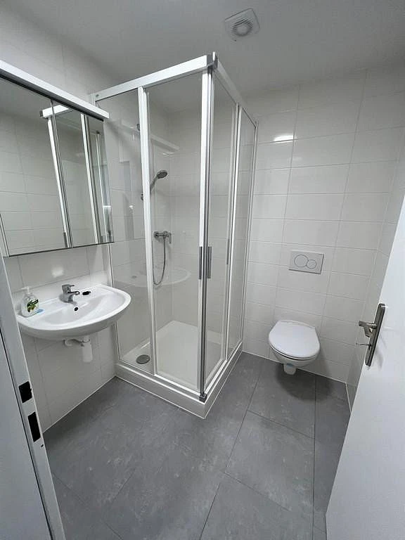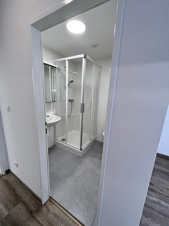 Za vstupními dveřmi bytu se nachází menší chodba (cca 3,20 m²), která disponuje prostornou šatní skříní. Po levé straně je koupelna se sprchovým koutem, závěsnou toaletou, umyvadlem, zrcadlovou skříňkou a otopným žebříkem. Koupelna má výměru cca 3,30 m². Hlavní dominantou bytu je útulný obytný pokoj s kuchyňskou linkou o výměře cca 11,10 m², který je orientovaný na východ. Kuchyňská linka je vybavena lednicí, dřezem a varnou dvou plotýnkou.