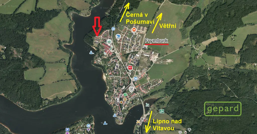Městys Frymburk – veškeré občanská vybavenost, TOP rekreační a vyhledávaná oblast přímo u Lipenského jezera, nezátopová oblast, pohodlné spojení Český Krumlov, České Budějovice, atd..