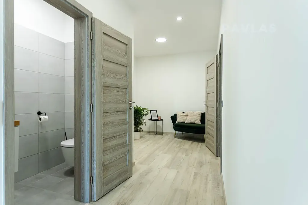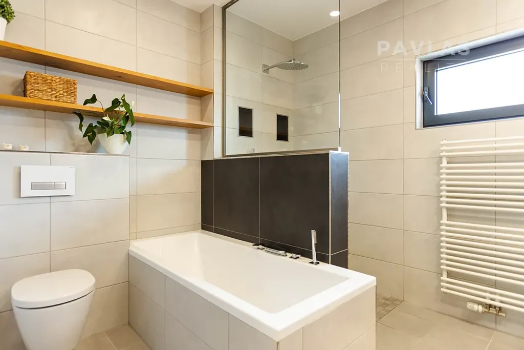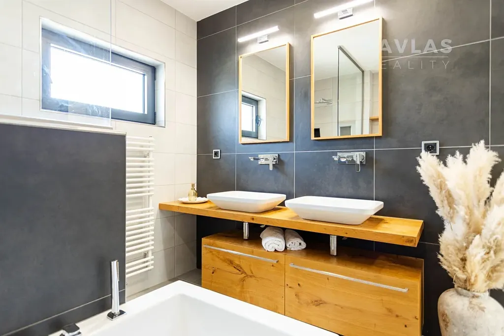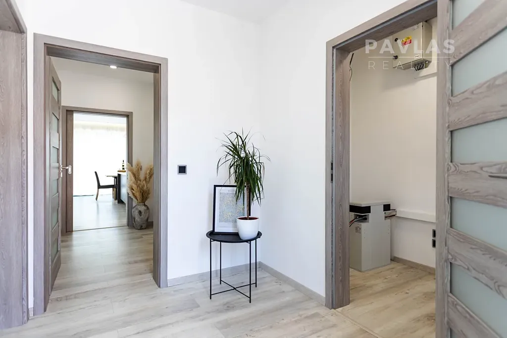 Dům disponuje třemi samostatnými neprůchozími ložnicemi, z nichž největší má rozlohu 16 m² a přímý přístup na terasu. Moderní stylová koupelna je vybavena dvěma umyvadly, prostorným sprchovým koutem a vanou. Další toaleta je přístupná z chodby. Před domem je kryté parkovací stání pro dvě auta, s možností vybudovat další parkovací místa. Z terasy vede vstup na zahradu, kde najdete vzrostlé ovocné stromy, poskytující stín během horkých letních dnů, venkovní dílnu a vyvýšené truhlíky pro kutily.