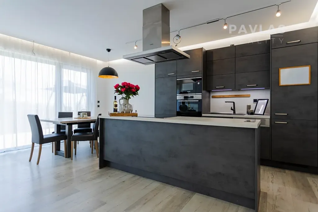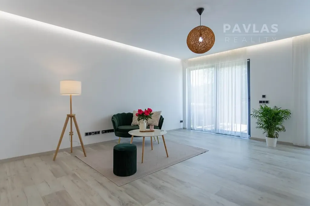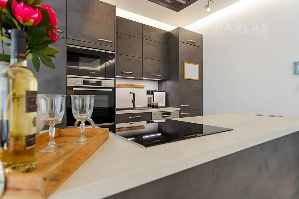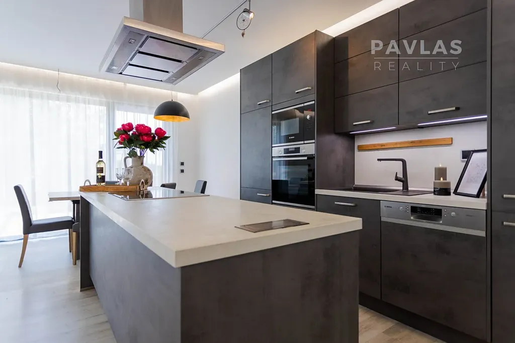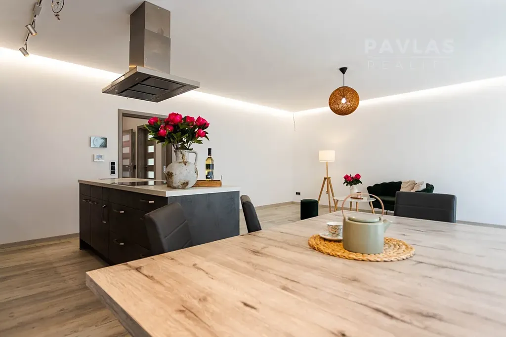 Dispozice domu zahrnuje prostorný obývací pokoj s kuchyní o velikosti 40 m², ze kterého je přístup na velkou terasu o výměře 25 m². Francouzská okna poskytují nádherný výhled na České Budějovice a přinášejí do interiéru spoustu přirozeného světla. Kuchyně s ostrůvkem je vybavena moderními spotřebiči Bosch, zaručujícími vysoký standard a komfort.