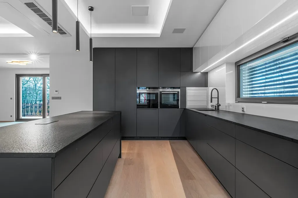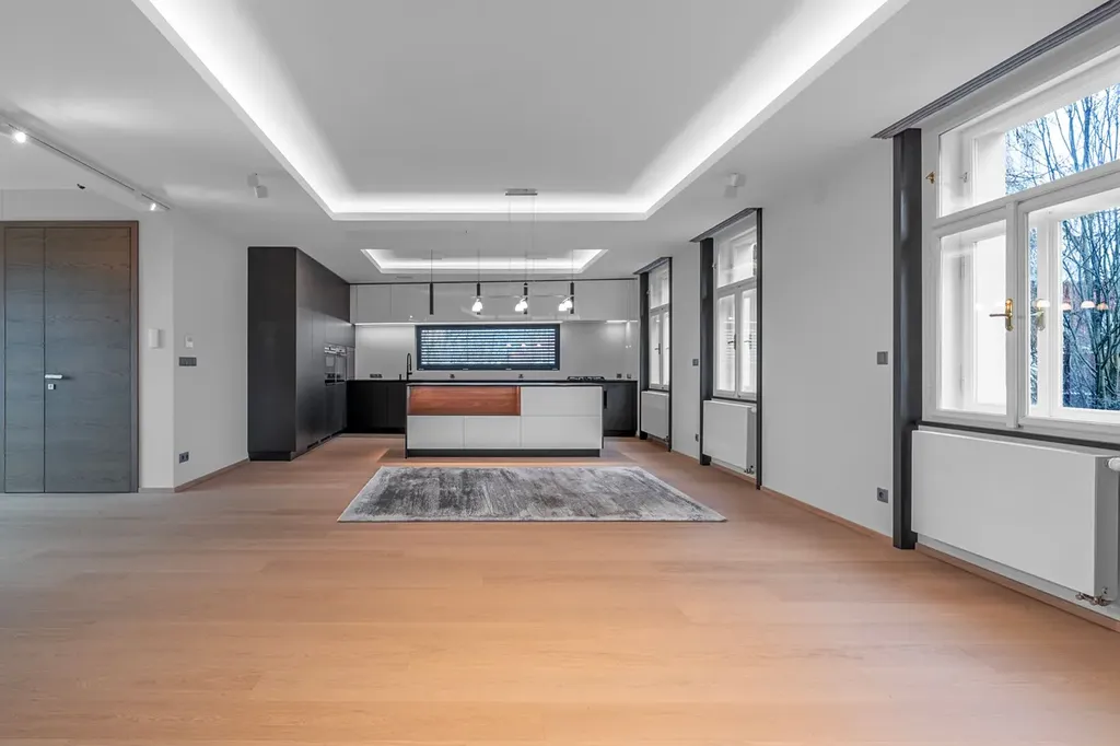 Dominantou bytu je světlý obytný prostor s elegantní kuchyní vybavenou značkovými vestavěnými spotřebiči (lednice, mrazák, myčka, mikrovlnná trouba, elektrická trouba, plynový sporák, digestoř). Interiér je částečně zařízen a ponechává dostatek prostoru pro individuální doladění.
