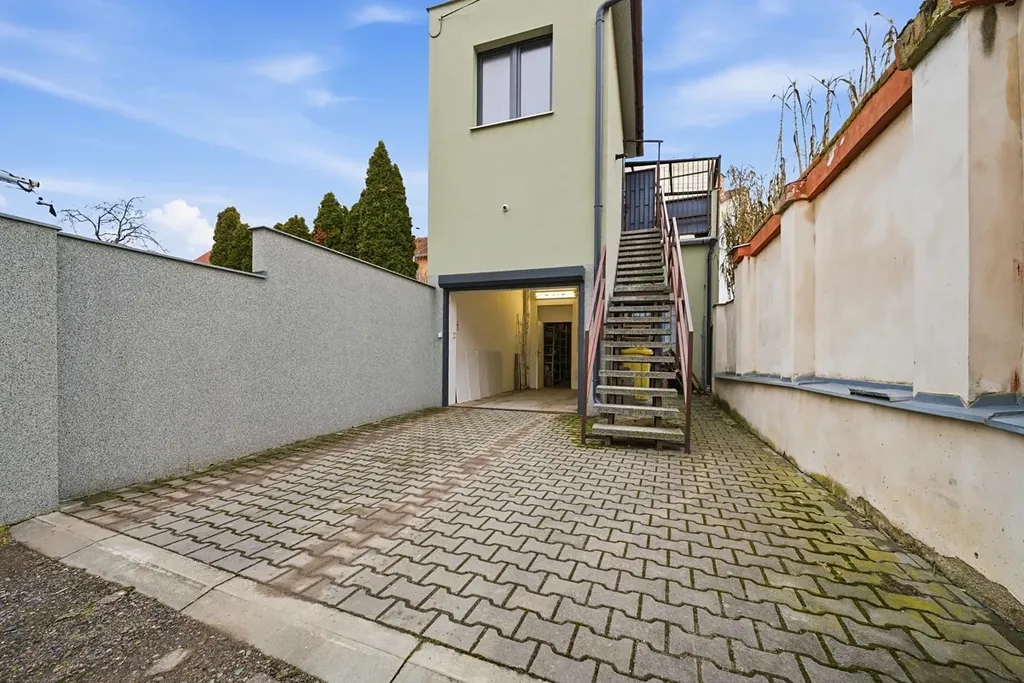 Přízemí o výměře cca 140 m je vhodné ke komerčnímu využití, například jako prodejna, showroom, kanceláře nebo služby. Má přímý vstup z hlavní ulice, v zadní části se nacházejí tři samostatné místnosti, toaleta a garáž s novými vraty, v prostoru je instalována klimatizace.