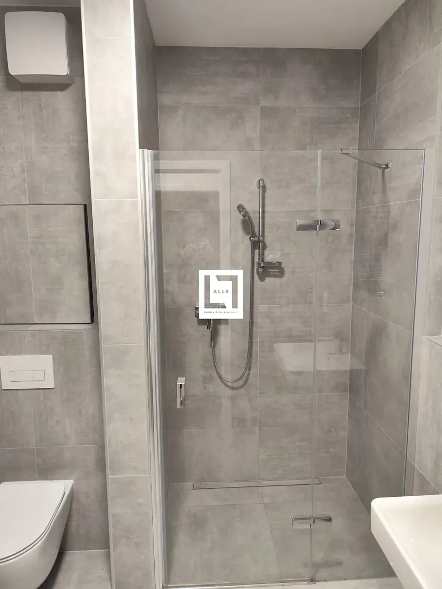V koupelně se nachází sprchový kout, umyvadlo, baterie, toaleta, otopný žebřík a pračka.