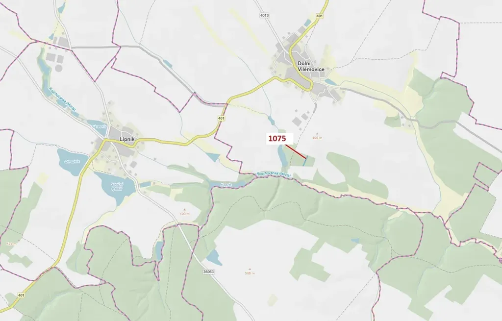 Lesní pozemek o výměře 1134 m2, parcelní číslo 1075, podíl 1/1, katastrální území Dolní Vilémovice, obec Dolní Vilémovice, obec s rozšířenou působností Třebíč, okres Třebíč, Kraj Vysočina. Po těžbě.