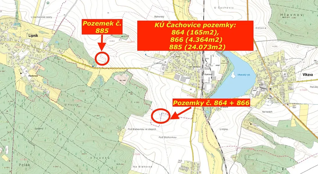 Jedná se o 4 rovinné zemědělské pozemky parc. 579/1, 864, 866, 885 o celkové výměře 34071 m2 s využitím u 3 pozemků jako orná půda s přístupem u pozemku parc. 885 ze silnice Čachovice – Lipník, u pozemků parc. 864, 866 po polích ve vlastnictví jiných osob. Využití pozemku parc. 579/1 je jako louka se zvýšenou hladinou spodní vody způsobenou Vlkavským potokem. Přístup k pozemku je přes pozemek jiného vlastníka.
