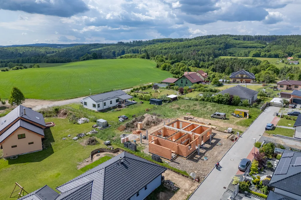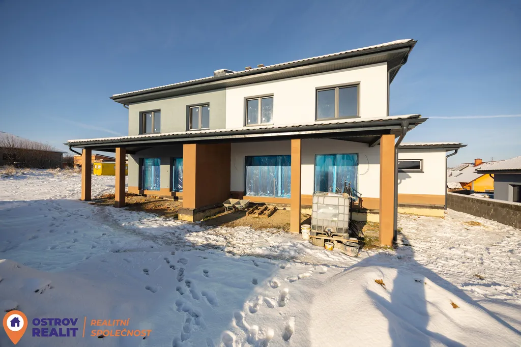 Stavba je ve velmi pokročilé fázi – dům má hotovou světlou fasádu, je kompletně osazen plastovými okny s izolačním trojsklem, vchodovými dveřmi i garážovými vraty. Elektroinstalace je rozvedena a aktuálně probíhají práce na vnitřních částech domu.
