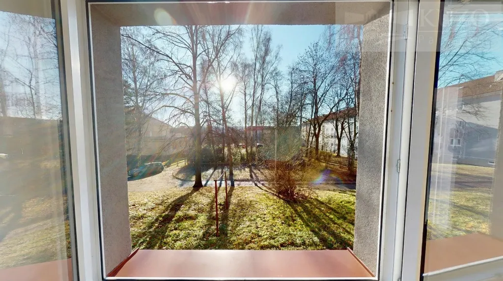 Výhled do zeleně: Okna (vyměněna za moderní plastová) obytných místností směřují do přilehlého parku, nikoliv do rušné ulice.