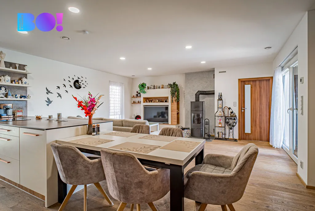 Srdcem domu je prosvětlený obývací pokoj s krbovými kamny, propojený s kuchyní přes barový pult a jídelní stůl. Kuchyňská linka nabízí dostatek úložného prostoru i praktickou spíž. Dále je v domě druhá koupelna se sprchovým koutem a samostatné WC. Součástí nemovitosti je technické zázemí a garáž pro dvě auta s přímým vstupem do domu. Před garáží se navíc nachází dvě další parkovací místa na oploceném pozemku.