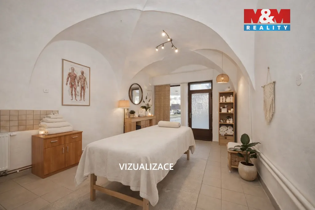 K dispozici je jedna prostorná místnost s klenutým stropem, sociální zařízení, skládek a úklidová komora. V sousední místnosti již působí zavedená kosmetička, což vytváří příjemné prostředí pro služby z oblasti péče o tělo a krásu.