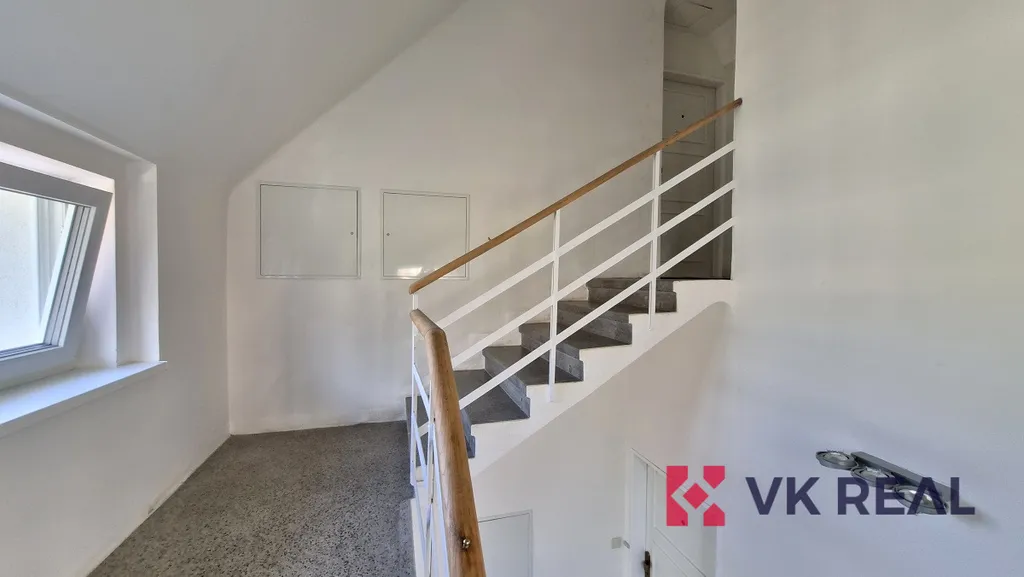 Byt se nachází ve třetím podlaží vily bez výtahu. Jedná se o loft zaujímající dispozici 1+kk a obytnou plochu cca 50m2 a pronajímá se zařízený dle fotografií. Dispozice je rozdělena následovně: ve spodním patře se nachází předsíň, koupelna se sprchou a WC a obývací pokoj s kuchyňskou linkou. Horní část bytu tvoří patro pro spaní. Kuchyňská linka je plně vybavena spotřebiči značky Elektrolux, v úložných vestavěných prostorách v předsíni je umístěna pračka, též značky Elektrolux. Vytápění je řešeno elektrickými přímotopy, ohřev teplé vody elektrickým bojlerem.