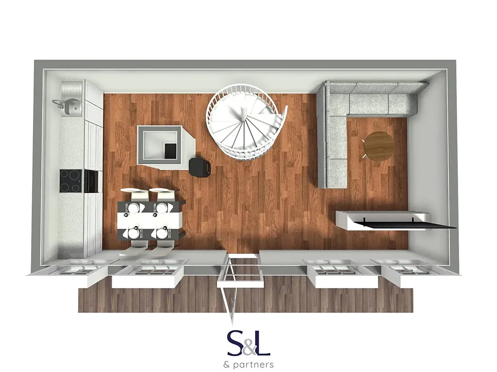 1. patro: obývací pokoj s kuchyní a krbovými kamny