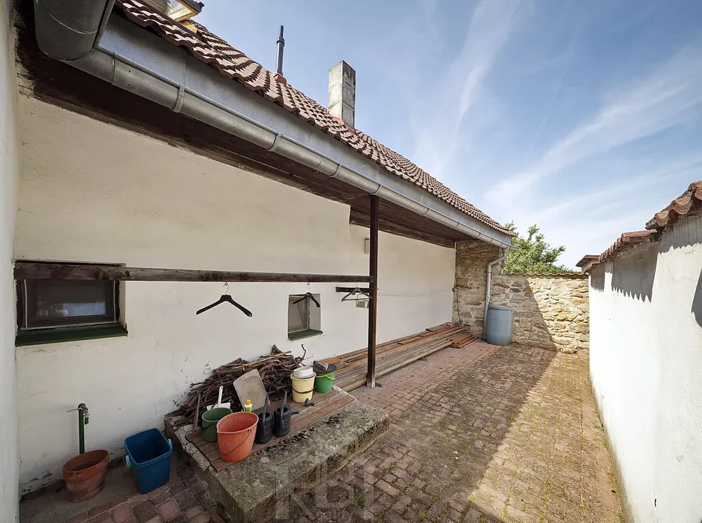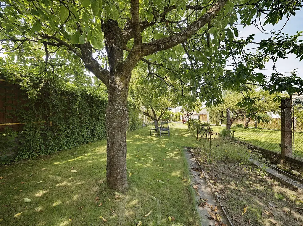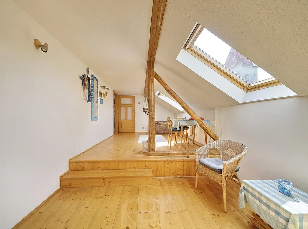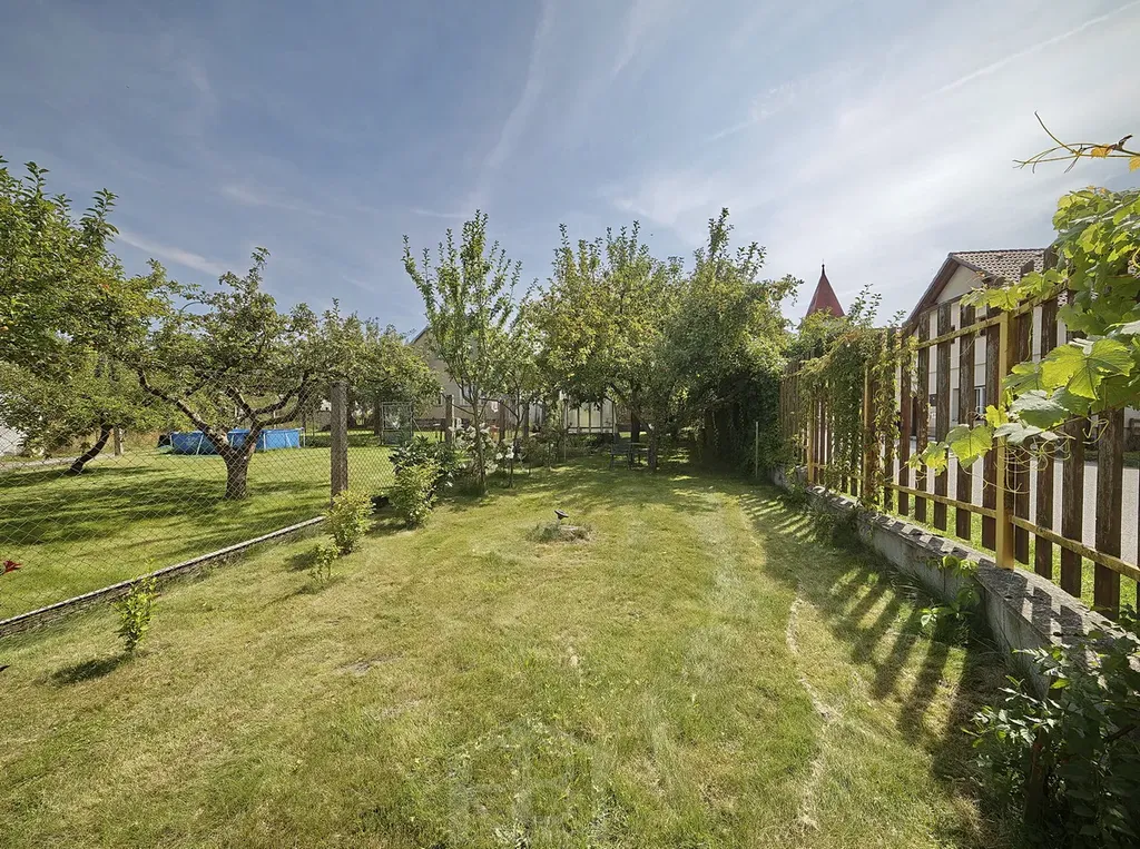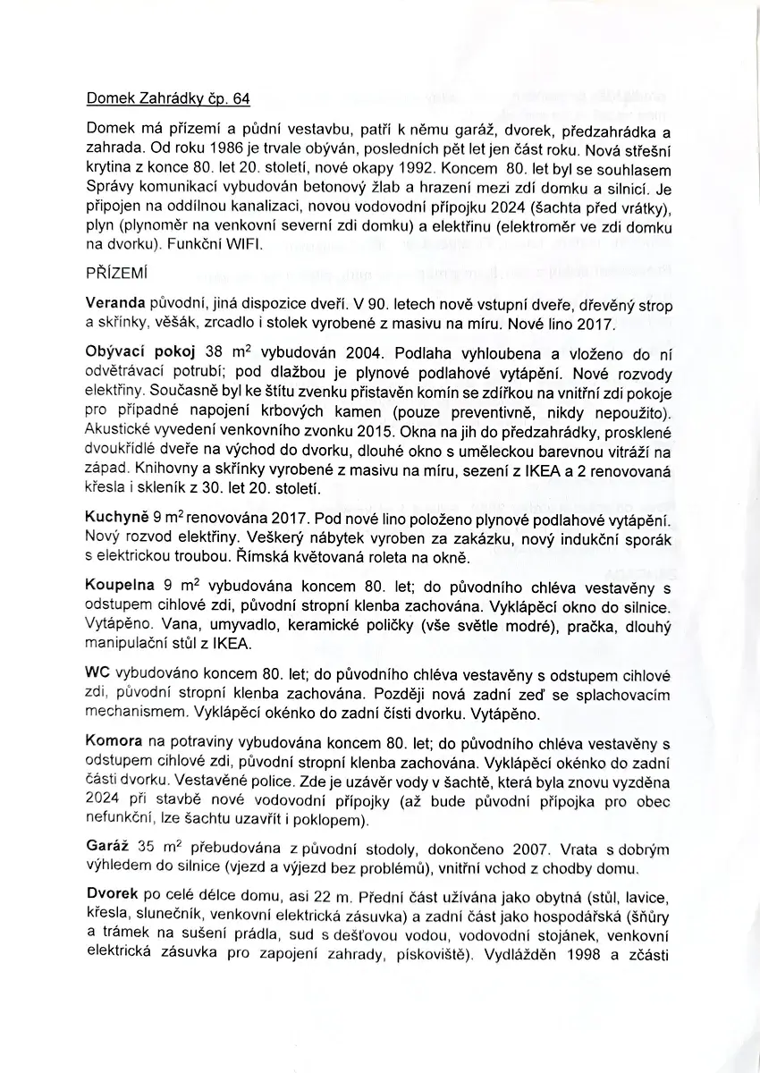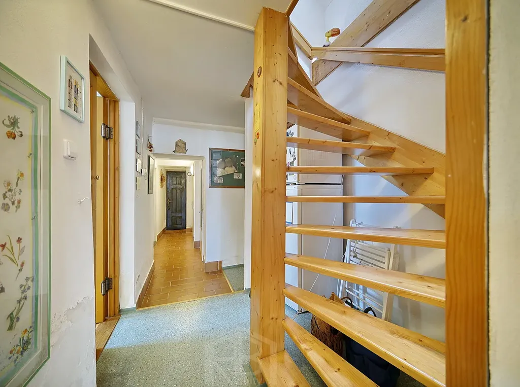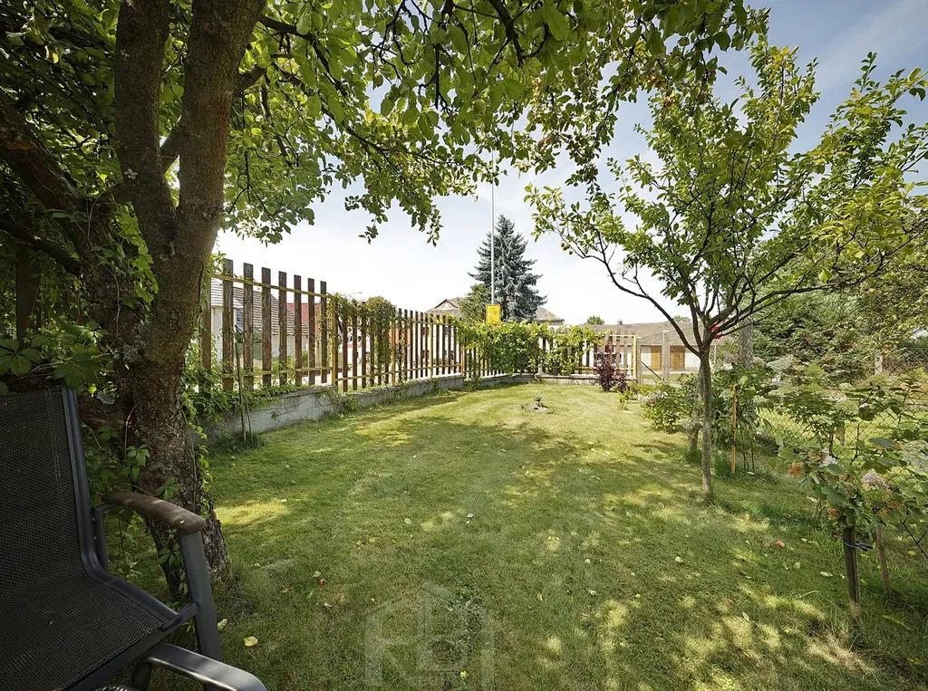 V podkroví jsou 3 prostorné pokoje, koupelna, WC a šatna. Za domem je menší uzavřený dvorek, před domem je předzahrádka a pár kroků od domu oplocená zahrada 182 m2, v níž je přístřešek na nářadí a skleník.