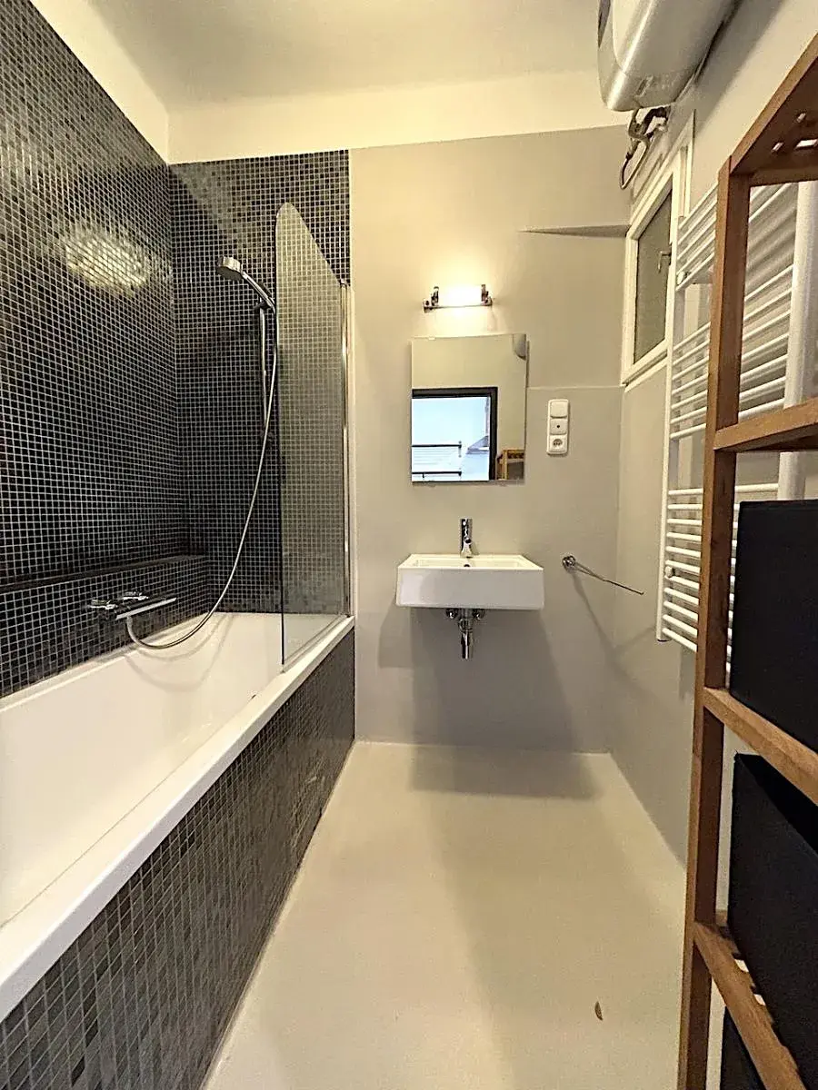Apartment consists of spacious entrance hall with kitchenette equipped with all appliances (electric hob and oven, dishwasher, fridge and washing machine with dryer), 3 separated bedrooms (2 bedrooms/1 living room), bathroom with bath tub, separated toilet and storage room. The apartment is nicely renovated, has plastic windows, parquet/tilled floor, smart electric heating.