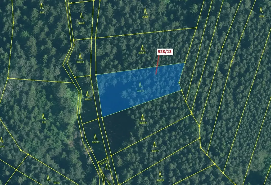 Lesní pozemek o výměře 1803 m2, parcelní číslo 928/13, podíl 1/1, katastrální území Hosty, obec Hosty, obec s rozšířenou působností Týn nad Vltavou, okres České Budějovice, Jihočeský kraj. Po těžbě.
