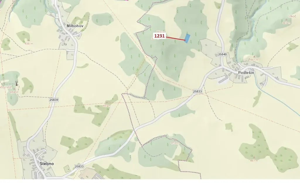 Lesní pozemek o výměře 1462 m2, parcelní číslo 1231, podíl 1/1, katastrální území Podlešín u Stebna, obec Stebno, obec s rozšířenou působností Ústí nad Labem, okres Ústí nad Labem, Ústecký kraj.
