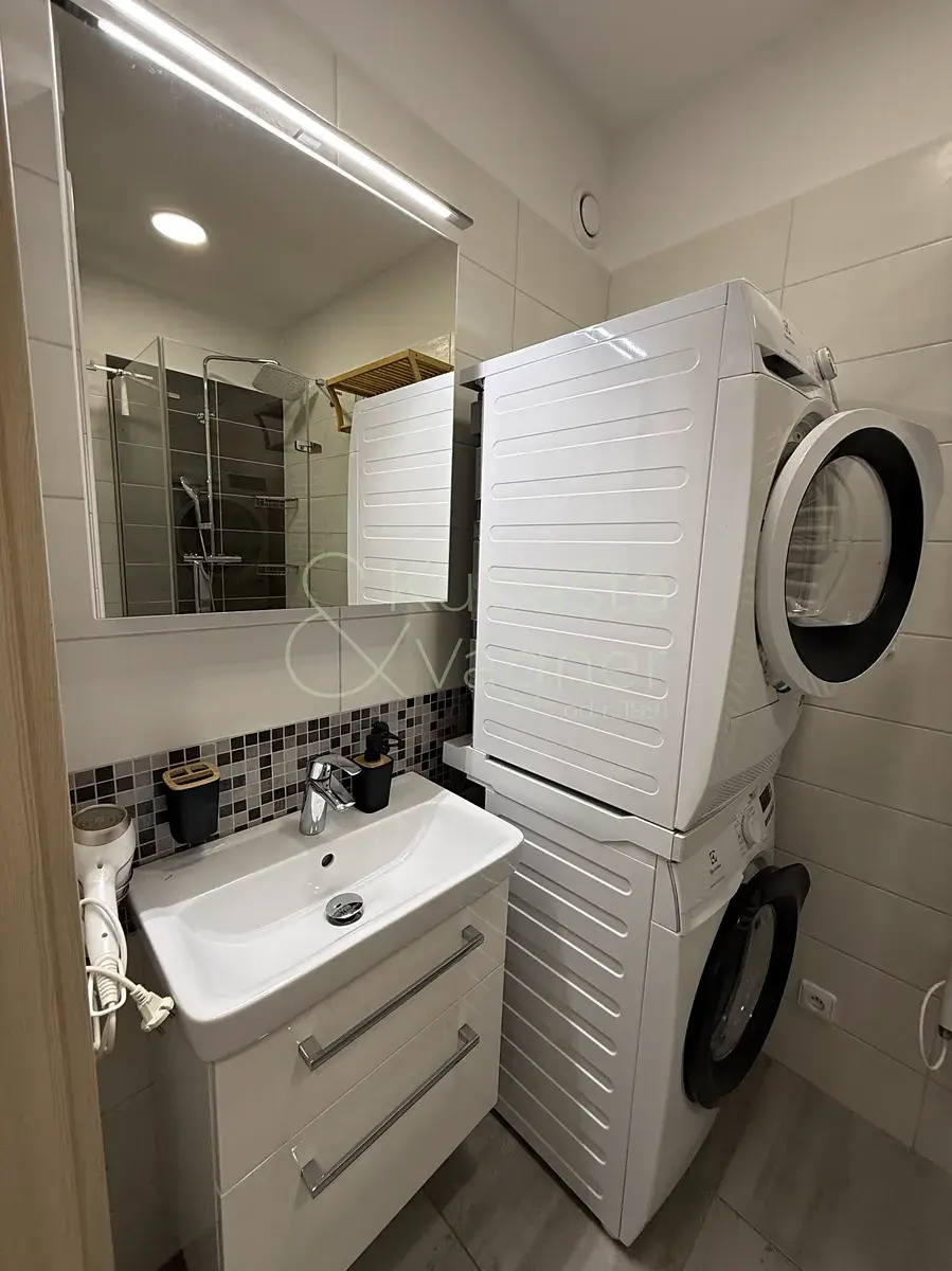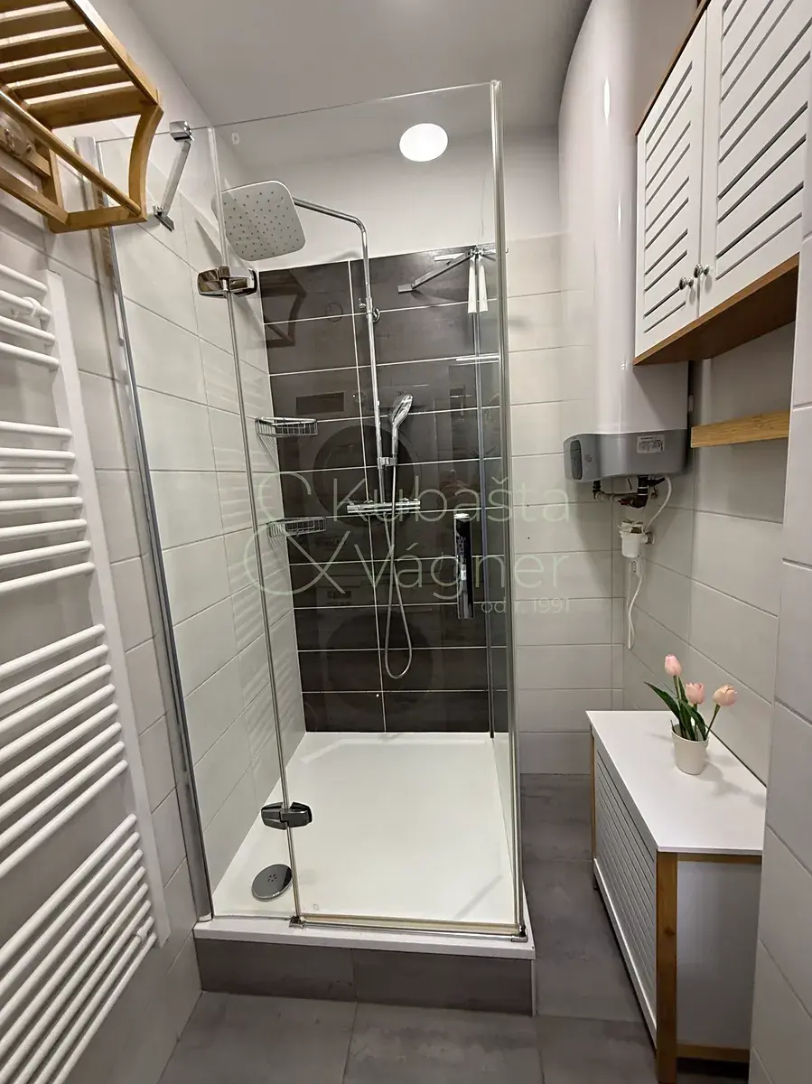 K dispozici jsou také dvě samostatné ložnice, částečně vybaveny a zařízeny. V chodbě pak máme samostatnou toaletu a koupelnu, vybavenou sprchovým koutem, zrcadlem a koupelnovou stěnou, pračkou a sušičkou, topným žebříkem a elektrickým ohřívačem vody.