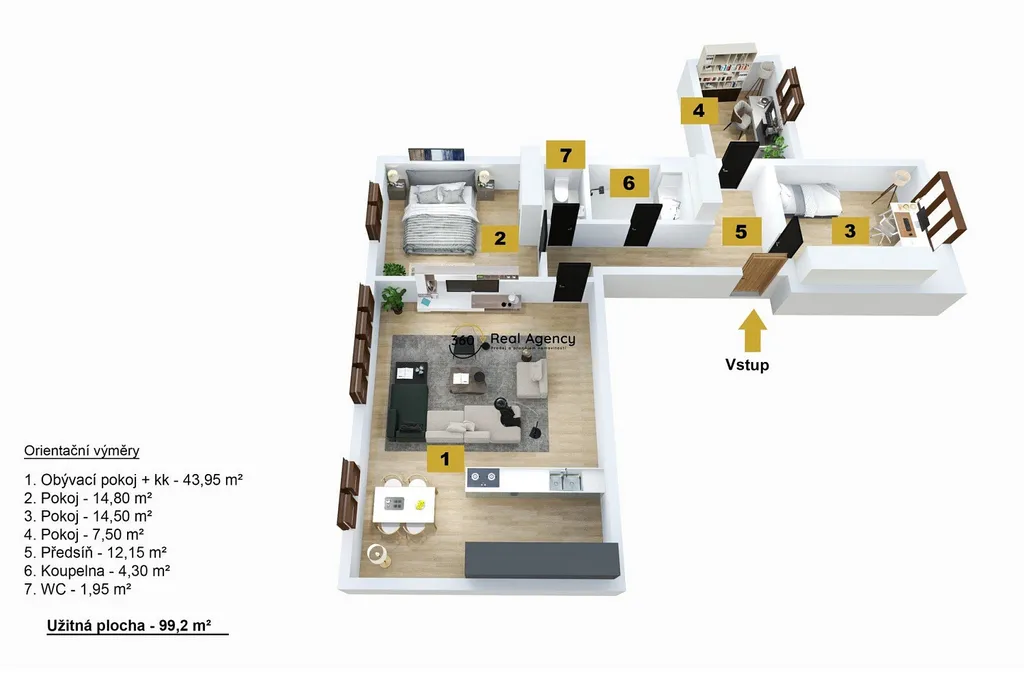 Byt zaujme především svou velkorysou dispozicí a flexibilním využitím prostoru. Aktuálně je řešen jako komfortní 3+kk, avšak snadno umožňuje plnohodnotné uspořádání 4+kk.