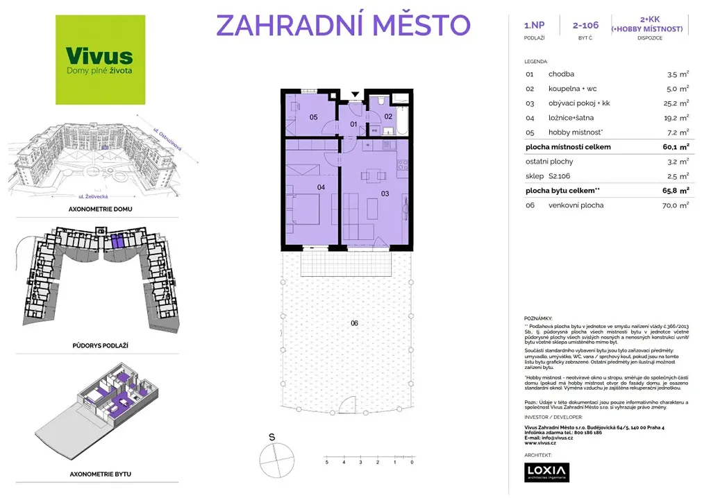 Praktický byt s příjemnou předzahrádkou se nachází v právě budovaném projektu VIVUS ZAHRADNÍ MĚSTO. Ten je situován jen pár minut chůze od vlakové stanice Zahradní Město, ze které je možné dojet za 11 minut do centra Prahy.