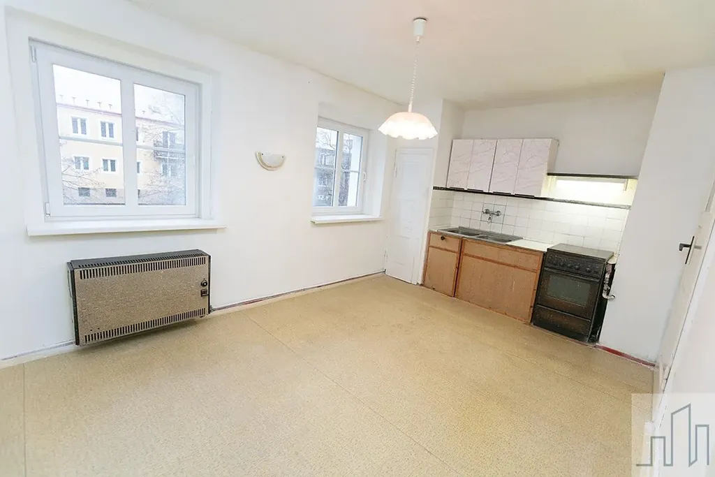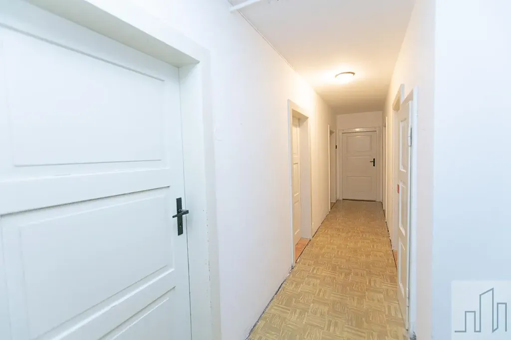 Samotný byt je v původním, avšak velmi zachovalém stavu. Působí čistě, svěže a vzdušně. Dispozice je řešena prostornou centrální chodbou, která prochází středem bytu. Na jedné straně se nacházejí tři velké pokoje (dva z nich jsou průchozí), obývací pokoj zůstal v původním stavu, ostatní místnosti jsou vyklizené a čerstvě vymalované. Další samostatný pokoj o velikosti cca 13 m je umístěn v zadní části bytu. Kuchyně byla otevřena do původní jídelny, čímž vznikl příjemný a prostorný kuchyňský kout s dostatkem místa pro rodinné setkávání. Koupelna s WC je situována u vstupu do bytu.