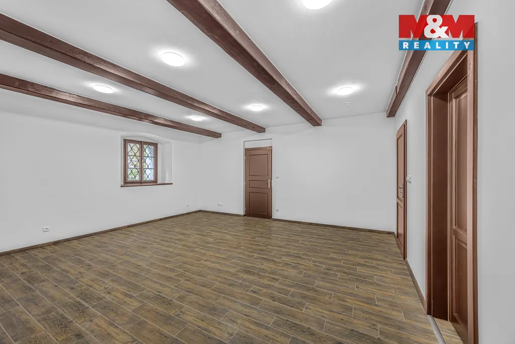 Dominantou je prostorný obývací pokoj s přípravou pro kuchyňskou linku o ploše téměř 30 m2 s nadstandardní dlažbou a podlahovým topením. Větší pokoj má 21,7 m2 a menší pokoj pak 12 m2. Koupelna s plochou 6,6 m2 je vybavena vanou, toaletou, umyvadlem, elektrickým bojlerem a přípravou na pračku. Přívod vody je zajištěn z místní studny v majetku SVJ.