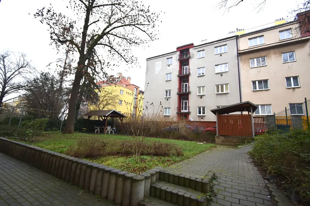Obyvatelé domu mají k dispozici pečlivě udržovanou společnou zahradu, která nabízí příjemné místo k odpočinku.