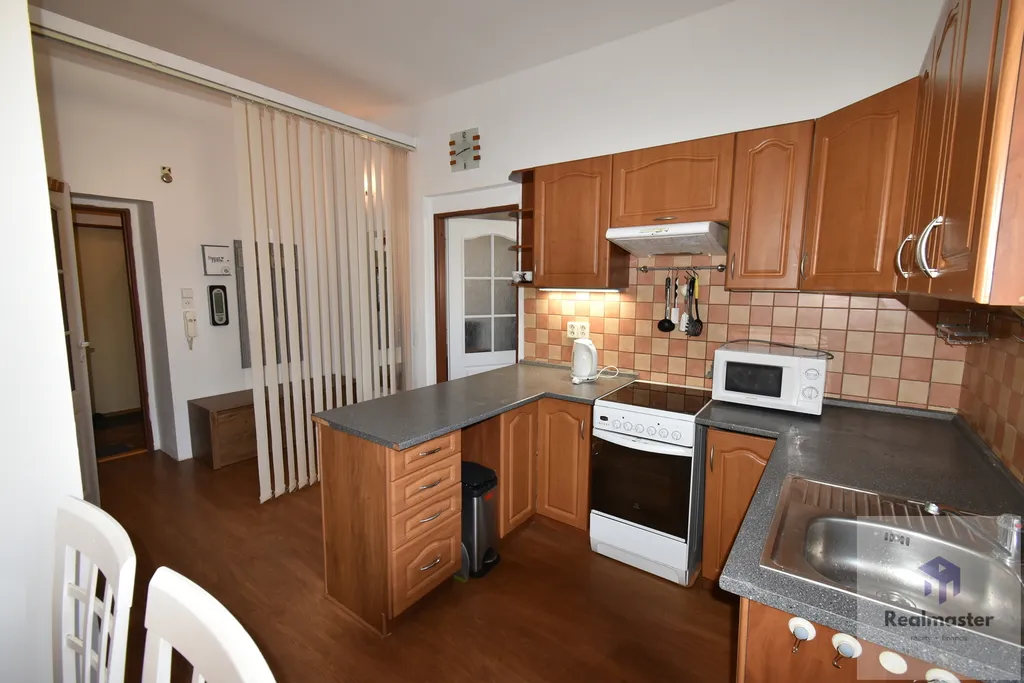 Částečně zařízený byt, krásně prosvětlený velkými okny, čistá rekonstruovaná koupelna s rohovou vanou, kuchyňská linka se spotřebiči.