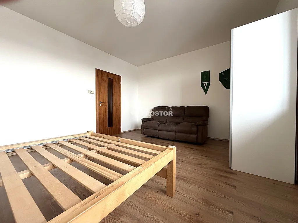 Dominantou bytu je prostorný obývací pokoj s kuchyňským koutem. Kuchyňská linka je kompletně vybavena spotřebiči a poskytuje dostatek pracovní plochy i úložných prostor. Otevřený koncept propojuje vaření, stolování i relaxaci v jeden harmonický celek a vytváří příjemné místo pro každodenní život i setkávání s přáteli. Z obývací části je rovněž vstup na druhou lodžii, která byt příjemně rozšiřuje o venkovní prostor. Koupelna je vybavena vanou a toaletou. Celkově byt působí velmi světlým, vzdušným a útulným dojmem a díky umístění v nástavbě poskytuje klidné bydlení s dostatkem soukromí.