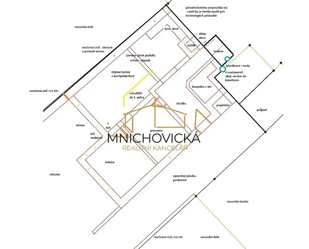 Celková velikost pozemku včetně stavby je 494m2. Zastavitelnost pozemku je až 80% a lze tak z vnitrobloku ještě realizovat přístavbu, např. pro byt 4kk o velikosti cca 190m2. Návrh přístavby - viz obr. - byl projednáván se stavebním úřadem v roce 2024 (před novelou stavebního zákona).