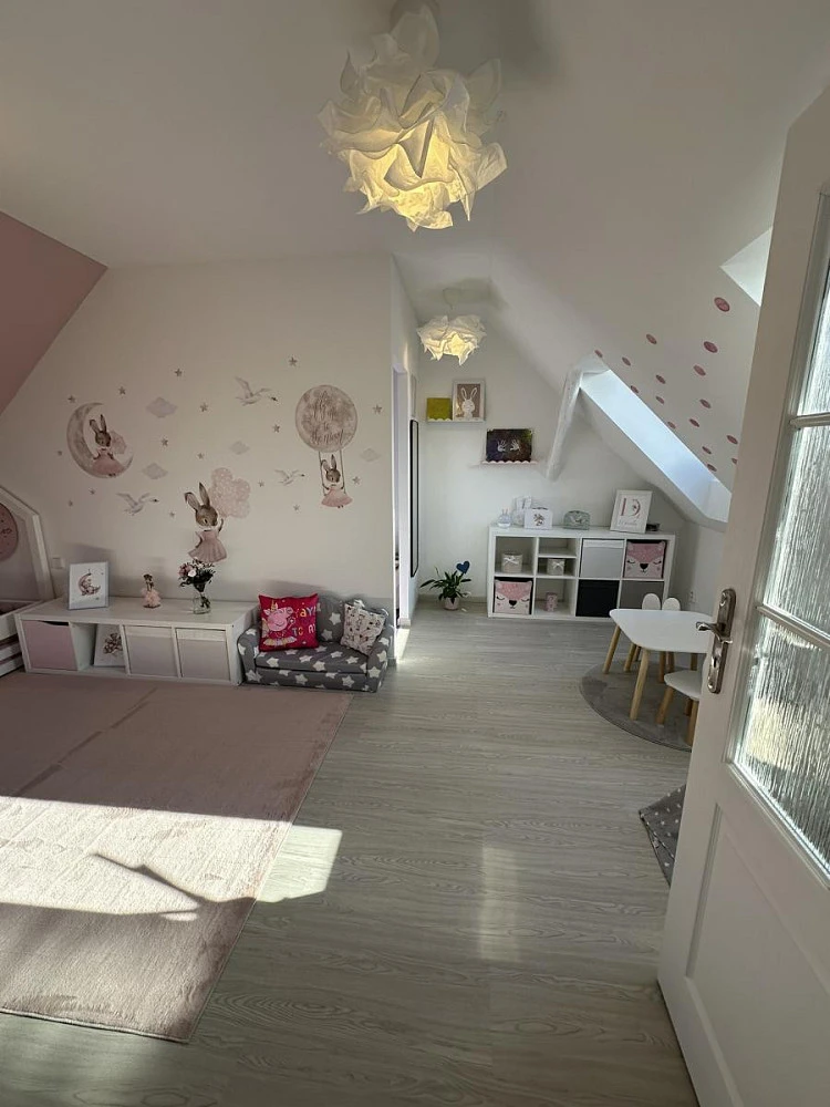 V patře domu se nachází ložnice, samostatné WC a pokoj s šatnou. Všechny místnosti jsou světlé a prostorné. Náklady na provoz domu pro tři osoby jsou velmi příznivé - pouze 5000 Kč za elektřinu a 1000 Kč za vodu. Díky optickému internetu si můžete užívat rychlého připojení k internetu.