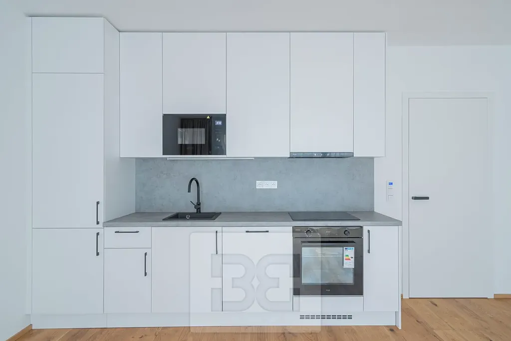 Součástí bytu je moderní kuchyňská linka vybavená spotřebiči (myčkou nádobí, lednicí, digestoří, mikrovlnnou troubou a pečicí troubou). V celé místnosti jsou položeny krásné dřevěné podlahy, které podtrhují celkově kvalitní charakter interiéru. Velká okna s designovými závěsy zajišťují dostatek denního světla a příjemnou atmosféru.