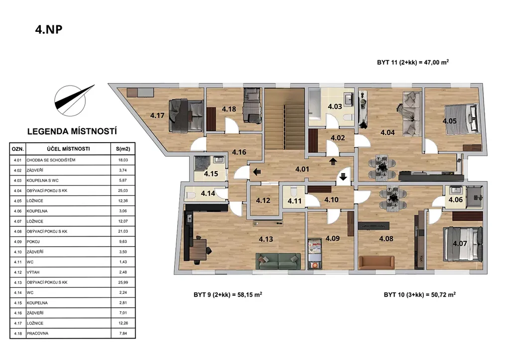 Podkroví: bytové jednotky od 47,00 m² do 58,15 m²