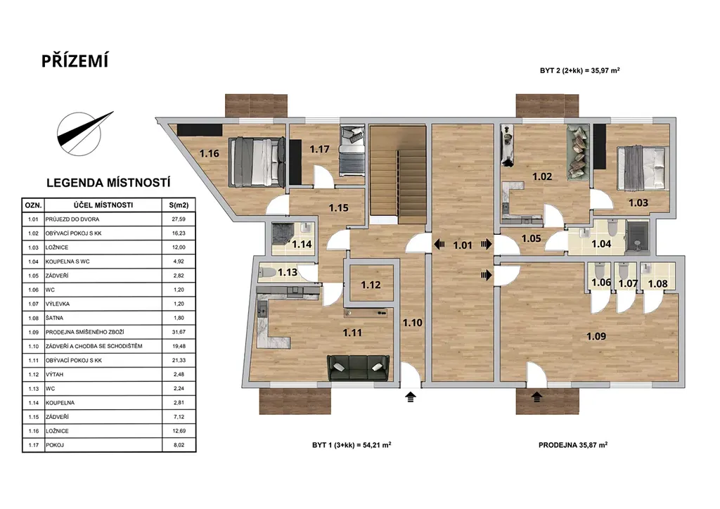 NP: bytové jednotky o velikosti 54,21 m² (3+kk) a 35,97 m² (2+kk), obchodní prostor o velikosti 35,87 m²