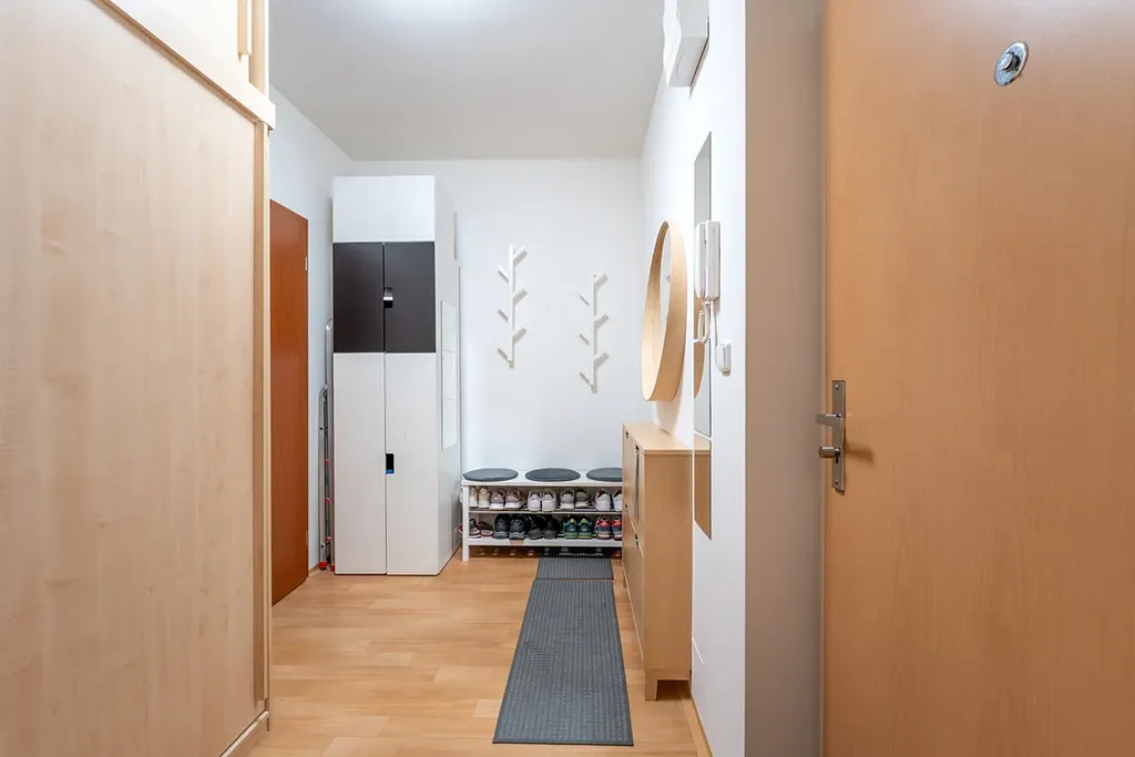 Dispozice bytu zahrnuje obývací pokoj s kuchyňským koutem, samostatnou ložnici, koupelnu a předsíň. Z obývacího pokoje je vstup na balkón, který nabízí příjemné místo k odpočinku. K bytu náleží také sklep, jenž zajišťuje dostatek úložného prostoru.