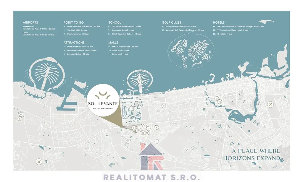 SOL LEVANTE se nachází v Jumeirah Village Triangle, poskytující snadný přístup k hlavním silnicím, jako jsou Sheikh Mohammed Bin Zayed Road a Al Khail Road, což umožňuje rychlé spojení s klíčovými destinacemi v Dubaji, včetně Dubai Marina (5-10 min) a Palm Jumeirah (10 min).