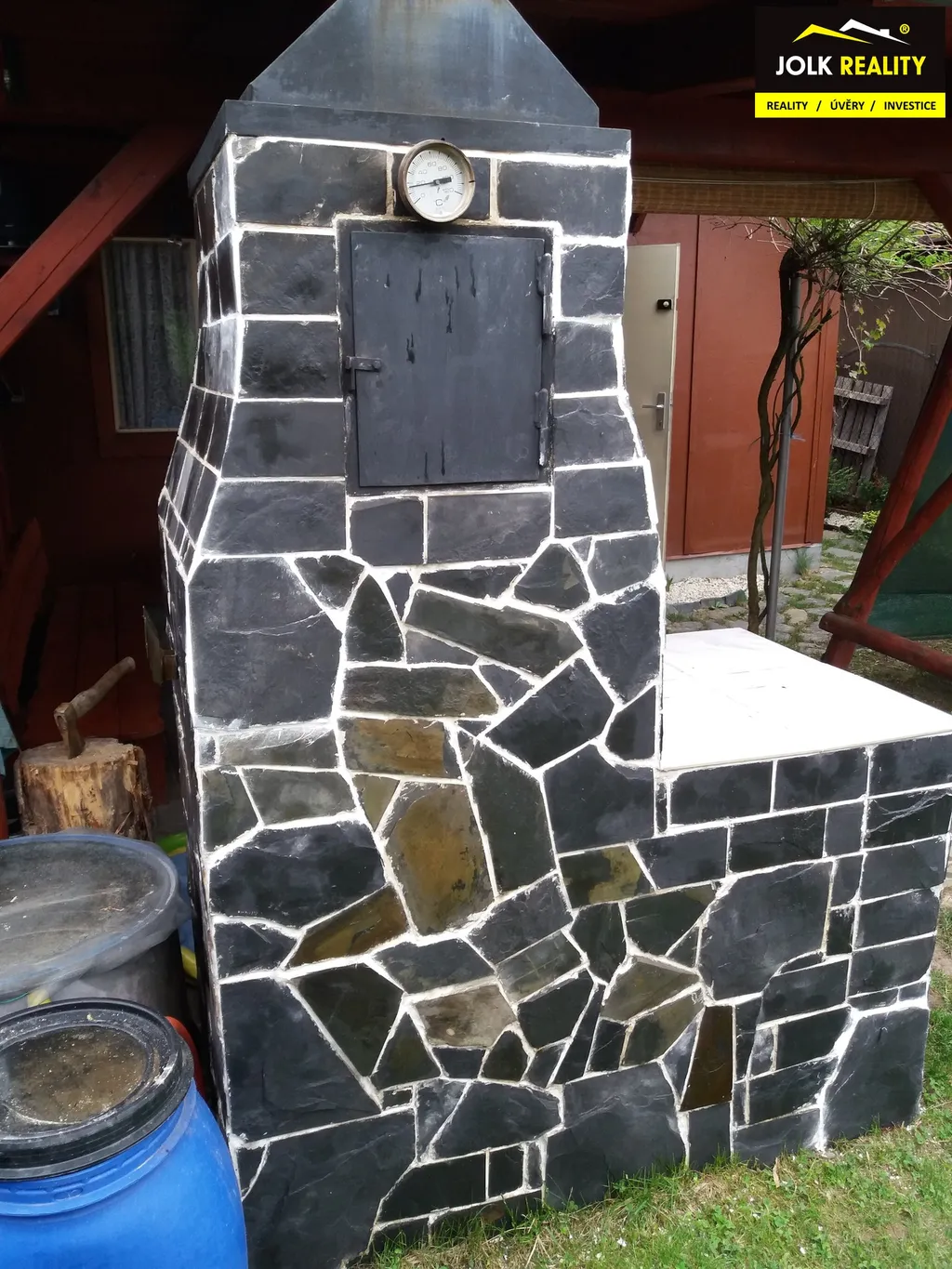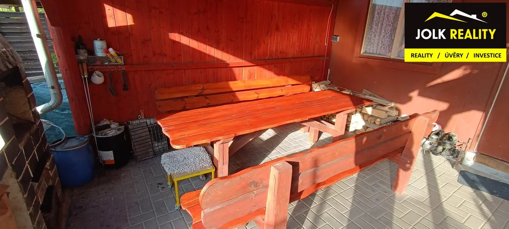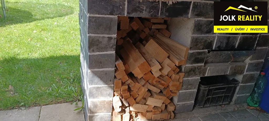 Na terase se nachází venkovní elektrická zásuvka, masivní dřevěné posezení a krb s odkládací plochou na přípravu pokrmů a dřevník.